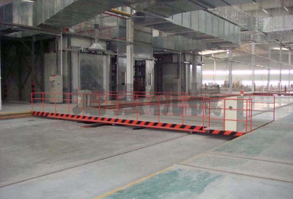 KPG滑觸線電動平移換軌車供電方式是:在軌道側(cè)面開設地溝,地溝內(nèi)安裝安全滑觸線,地溝上鋪有單面用鉸鏈固定于地上的蓋板或安裝于地溝的側(cè)面。電動平車運行時通過安裝在地溝翻板裝置,將蓋板掀起,翻板裝置內(nèi)有同安全滑觸線集電器聯(lián)接的電纜。電動平車通過后蓋板自動放回地面,能保證無軌車輛順利通過。KPG側(cè)滑觸線電動平車不受運行距離的限制。將交流380V的安全滑觸線直接引入平車交流控制系統(tǒng),來控制平車的啟動、停止、前進、后退等。通過平車的移動帶動安全滑觸線的滑塊來實現(xiàn)給平車供電,安全滑觸線受安裝未知的限制,可以安裝在地溝內(nèi)側(cè)墻體上,來實現(xiàn)地溝內(nèi)的電源引入軌道平車上,操作系統(tǒng)為低壓AC36V電源控制。是車間流水生產(chǎn)線的 ;該平車適用于運行距離不長(≤200m)、使用頻率極高、整車高度較低、流水線作業(yè)等場合。