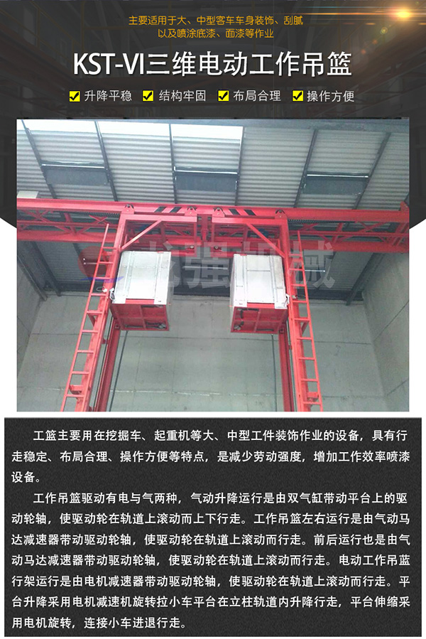 • 工籃主要用在挖掘車、起重機(jī)等大、中型工件裝飾作業(yè)的設(shè)備,具有行走穩(wěn)定、布局合理、操作方便等特點(diǎn),是減少勞動(dòng)強(qiáng)度,增加工作效率噴漆設(shè)備。