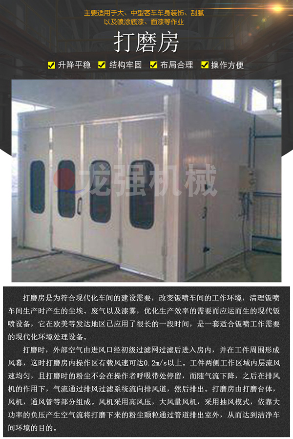 打磨房是為滿足現(xiàn)代化車間的建設(shè)需要,改善鈑噴車間的工作環(huán)境,清除鈑噴車間生產(chǎn)時產(chǎn)生的塵埃、廢氣以及漆霧,提高生產(chǎn)效率的需要而應(yīng)運而生的現(xiàn)代鈑噴設(shè)備,它在歐美等發(fā)達地區(qū)已應(yīng)用了很長的一段時間,是一套極適合鈑噴工作需要的現(xiàn)代化環(huán)境處理設(shè)備。